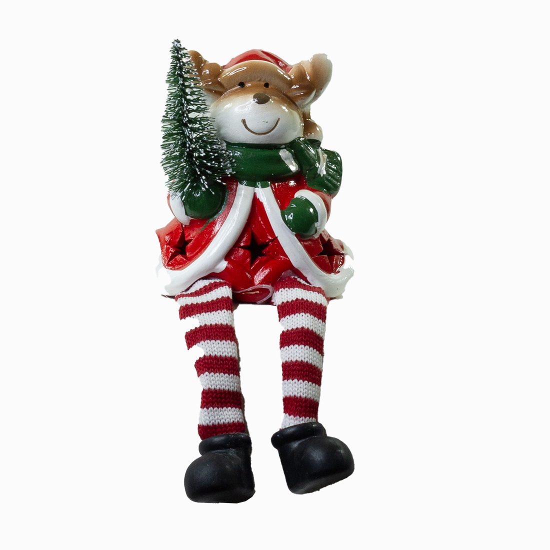 Det sødeste lille keramik rensdyr med stof dingleben og plast sko. Har et piberenser juletræ i hænderne. Der er skåret små stjerner i den, så lyset kan skinne igennem. Den er komplet med batterier, så skal bare tændes, og så er der lys i mørket. Så fin at have siddende på en hylde eller lign.