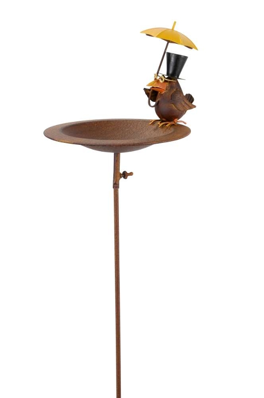 Det sødeste fuglebad med fuglen Rasmus med hans lille paraply, siddende på kanten. Så er der altid vand til havens fugle og insekter, hvis man hælder vand i det. Perfekt i en krukke eller i havens bede! Stangen kan presses ned i bedet, krukken eller lignende. Fuglebadet er lavet i metal, der er malet så det ligner rust. Rasmus er malet i skønne farver. En rigtig god gaveidé.