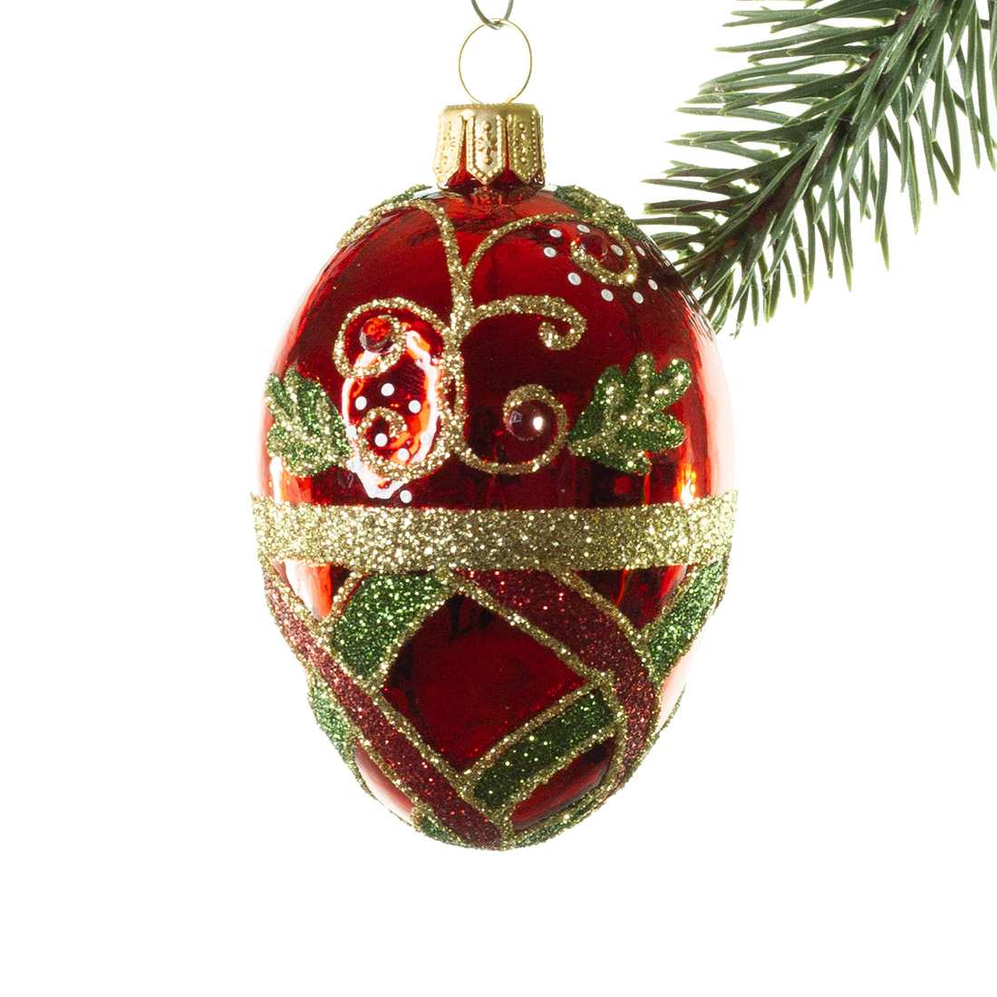 Ægget er mundblæst ind i en gammel jernform. Kuglerne bliver dekoreret i hånden i gammeldags stil, dekoreret med en masse glimmer og similisten. Nu er den klar til at dekorere alverdens smukke træer!