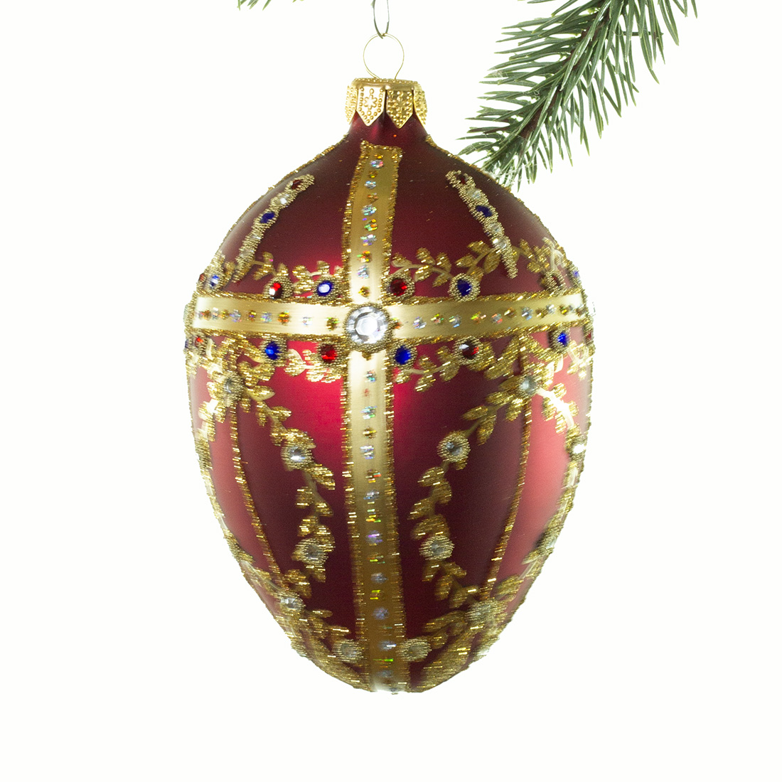 Smukt stort mundblæst Fabergé lignende æg. Malet i mat rød med guldfarvet mønster. Fyldt med en masse glimmer og similisten samt små guldfarvede kugler. Håndlavet på et glaspusteri i Polen. Lavet efter gamle traditioner.
