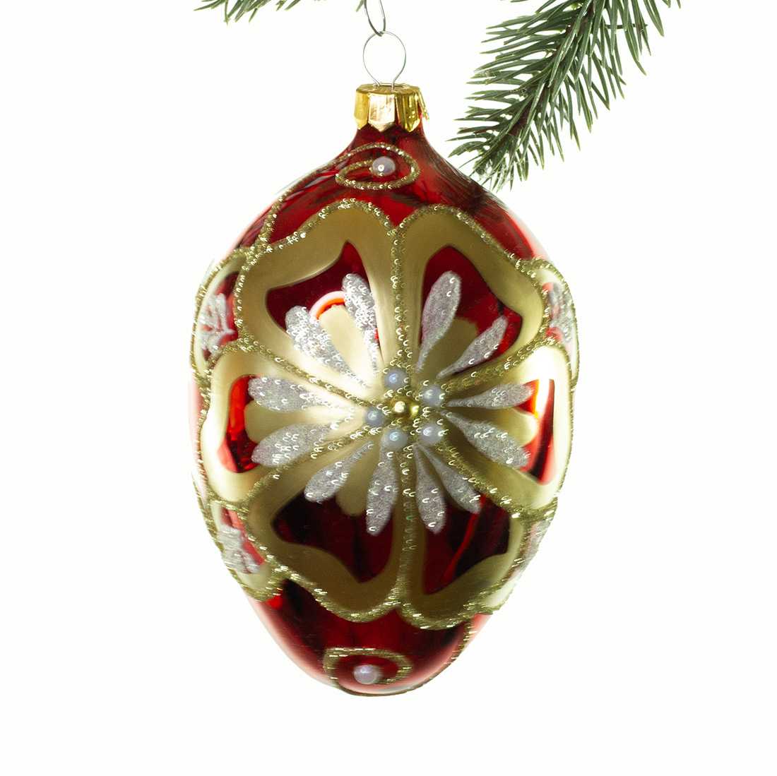 Smukt stort mundblæst Fabergé lignende æg. Malet i blank rød med guld og hvid farvet blomster mønster. Fyldt med en masse glimmer og gyldne sten samt halve perler. Håndlavet på et glaspusteri i Polen. Lavet efter gamle traditioner.