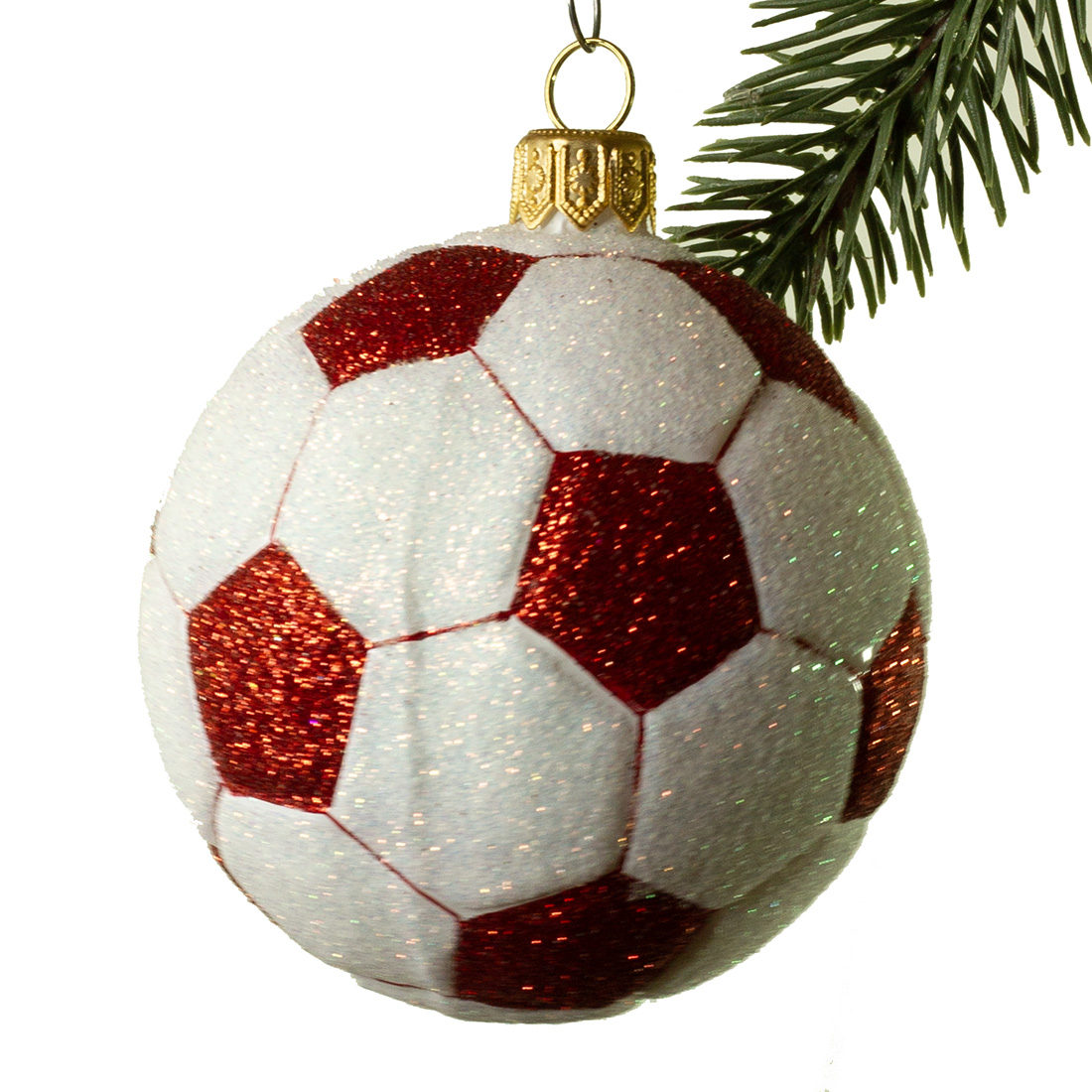 Fodbolden er mundblæst ind i en gammel jernform. Kuglerne bliver dekoreret i hånden i gammeldags stil. Nu er den klar til at dekorere alverdens smukke træer!