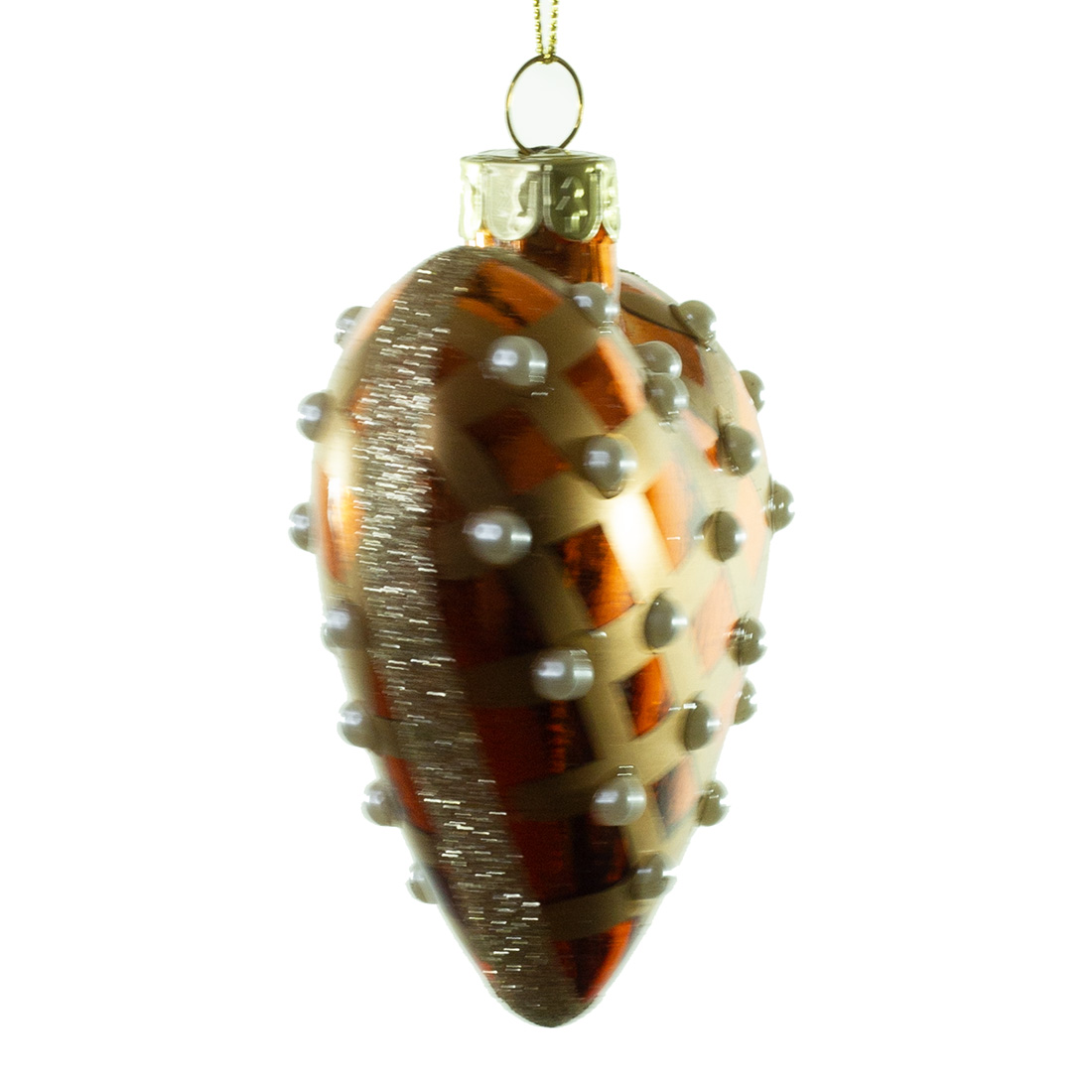 Virkelig flot glashjerte med perler. Malet i blank orange, med tern i mat guld og guldglimmer i kanten. Virkelig pyntesyg. Kan hænge på juletræet, i vinduet eller, hvor der lige mangler det ekstra.
