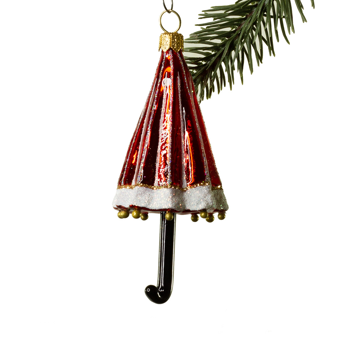 Paraplyen er mundblæst ind i en gammel jernform. Glaskuglerne bliver dekoreret i hånden i gammeldags retrostil. Dyppet i glimmer. Nu er den klar til at dekorere alverdens smukke træer!