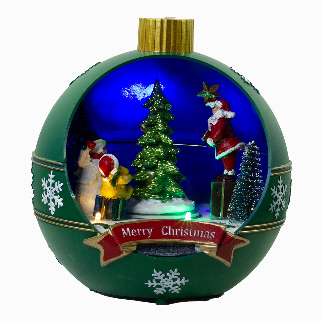 Den fineste store julekugle med julelandskab til julebyen med julemanden, der pynter juletræ, alt imens snemanden og bamse kigger med. Juletræet drejer rundt, imens der spiller musik, der kan slås fra. Lyser flot op og juletræet drejer, når der kommer tre stk. AA batterier i. Batterier medfølger ikke. Kan kører med adapter 4,5 volt.