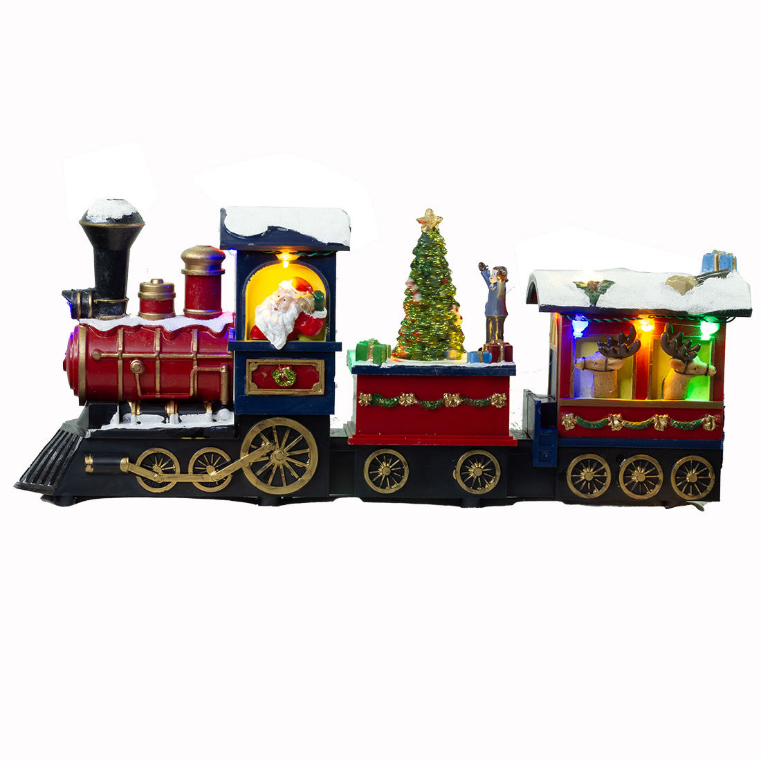 Det fineste store juletog med julemanden som togføre på vej til julebyen, alt imens juletræet drejer rundt på den midterste vogn. Rensdyrene kigger ud af vinduerne i den bagerste vogn. Lyser flot op og juletræet drejer, når der kommer tre stk. AA batterier i. Batterier medfølger ikke. Kan kører med adapter 4,5 volt.