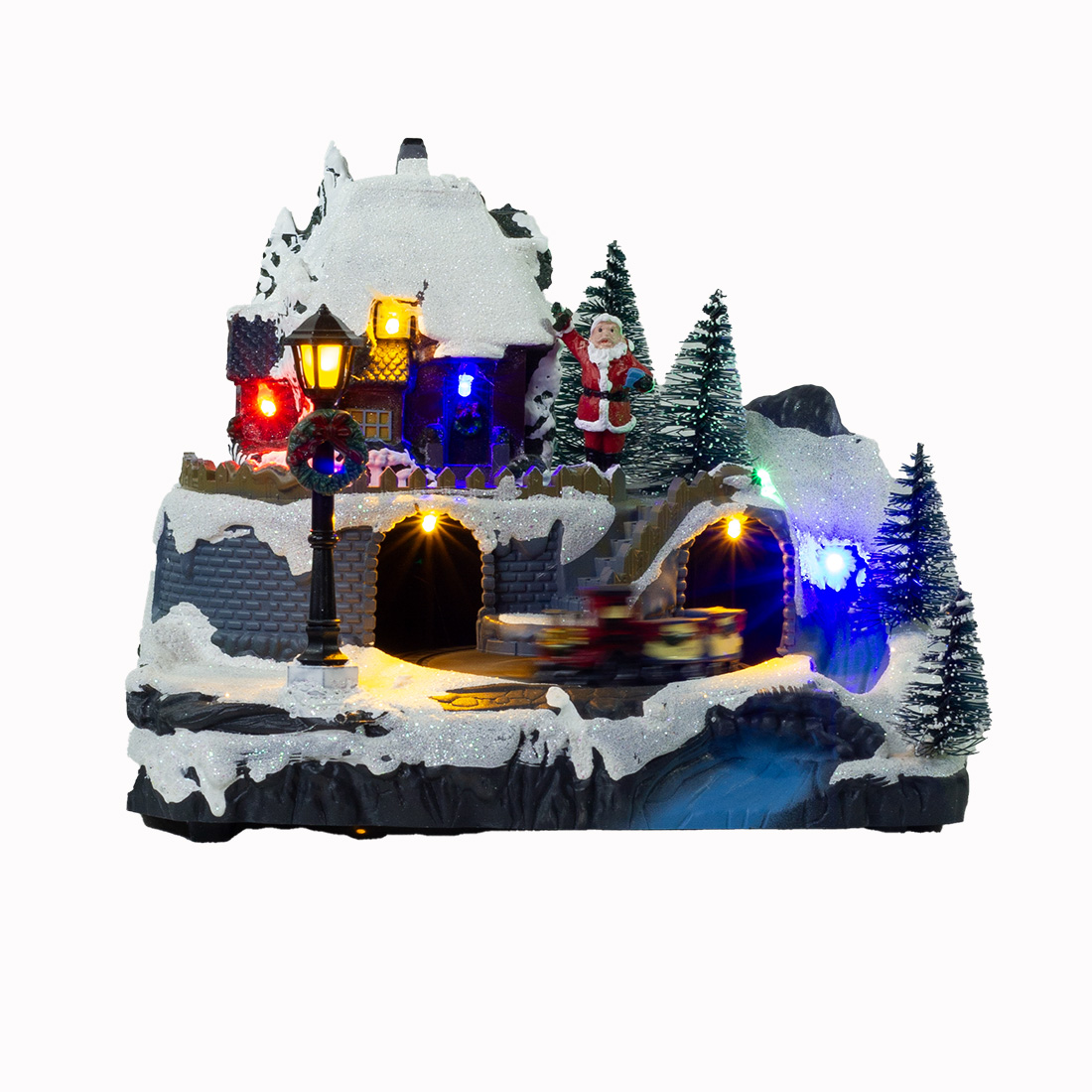 Det flotteste lille julelandskab til julebyen med julemanden, der står og vinker ved et hus, alt imens et tog kører igennem tunnelen under ham. Lyser flot op og toget bevæger sig rundt, når der kommer tre stk. AA batterier i. Batterier medfølger ikke. Kan kører med adapter 4,5 volt.