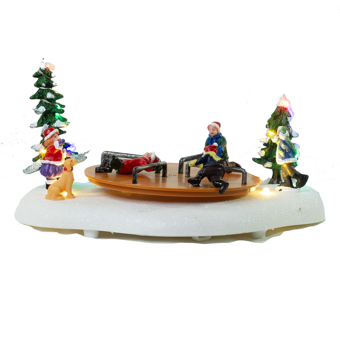 Det flotteste julelandskab til julebyen med en flot karrusel, hvor børnene ‘hviner’ imens de drejer rundt. Børnene synes, det er fantastisk. Karrusellen drejer rundt. Lyser flot op og karruselen drejer, når der kommer tre stk. AA batterier i. Batterier medfølger ikke. Kan kører med adapter 4,5 volt.