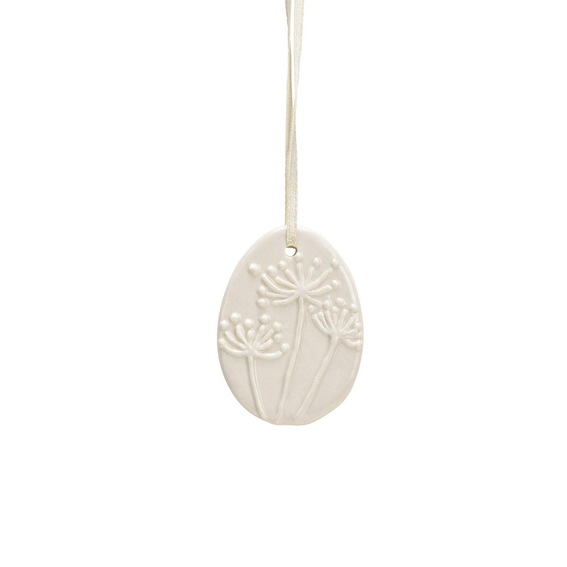 Det smukkeste og fineste lille flade æg med præget allium, lavet i porcelæn og blankglaseret på forsiden. Bagsiden står mat hvid. Har et fint ‘silkebånd’ til ophæng.