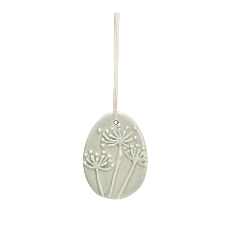 Det smukkeste og fineste lille flade æg med præget allium, lavet i porcelæn og blankglaseret på forsiden. Bagsiden står mat hvid. Har et fint ‘silkebånd’ til ophæng.
