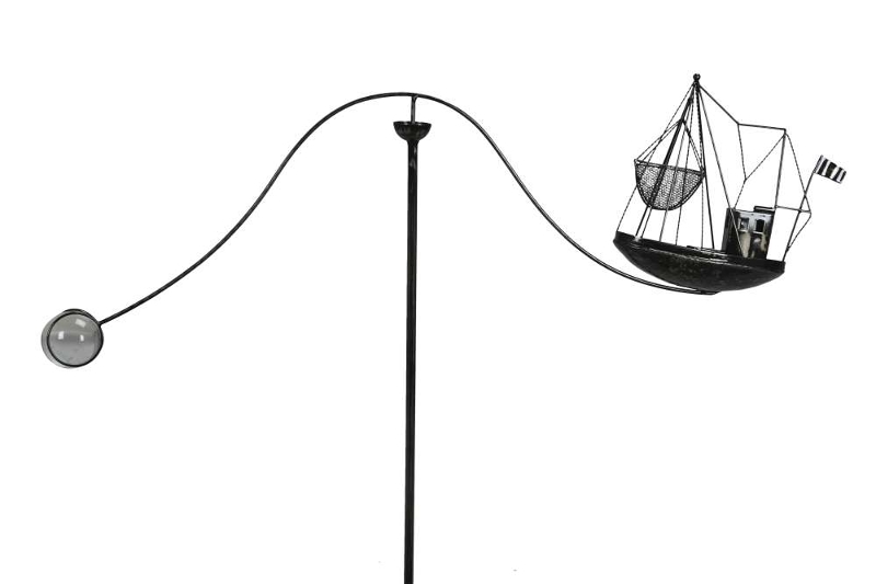 Skønt og sjovt vindspil med en meget flot fiskekutter med fiskenet. Oplagt, hvis man bor ved vandet, eller elsker at fiske. Det er lavet i metal med, malet i sort og blank stål og afsluttet med en glaskugle. Det skaber en masse bevægelse i haven, når det snurre rundt om sig selv i vinden. Flot i et blomsterbed over stauder, hvor det nærmest naturligt passer ind. Også rigtig sød ved havedammen. En rigtig god kvalitet!