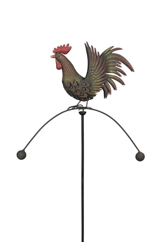 Skønt og sjovt vindspil med en meget stolt og lidt stor hane. Oplagt, hvis man har/ har haft høns. Det er lavet i metal med, malet i fine naturlige farver, og afsluttet med en metalkugle. Det skaber en masse bevægelse i haven, når det snurre rundt om sig selv i vinden. Flot i et blomsterbed over stauder, hvor det nærmest naturligt passer ind. Også rigtig sød ved havedammen. En rigtig god kvalitet!